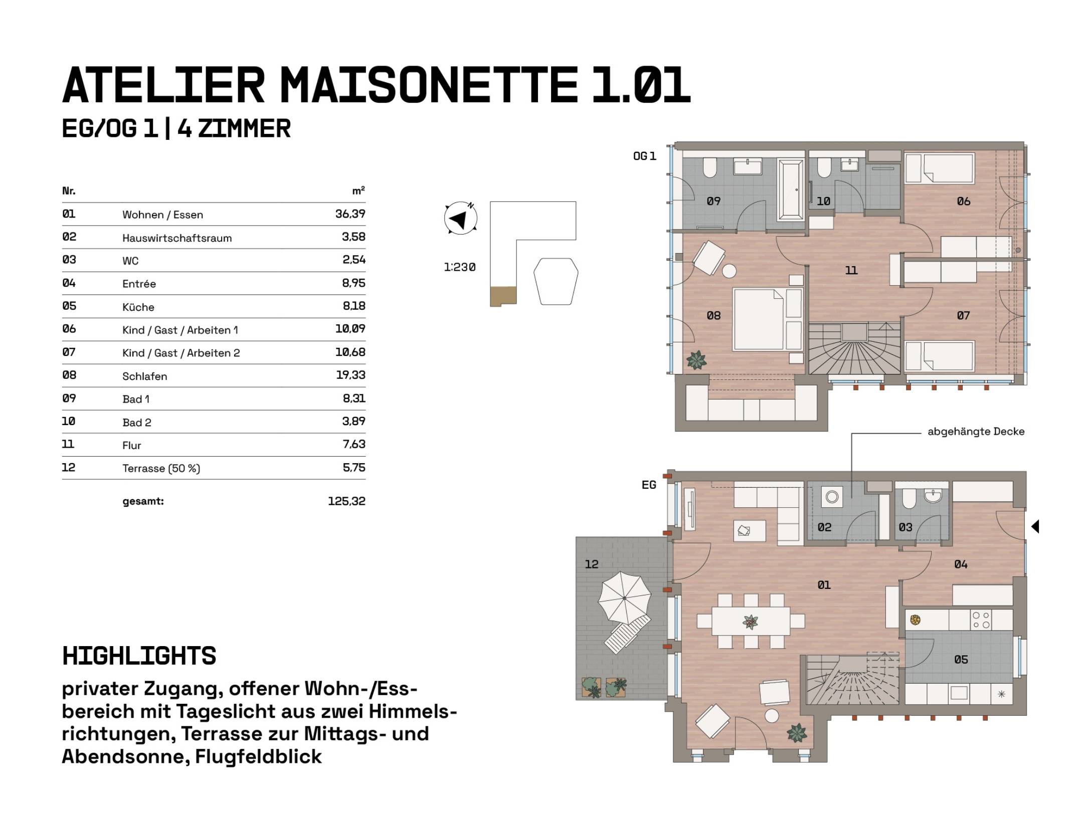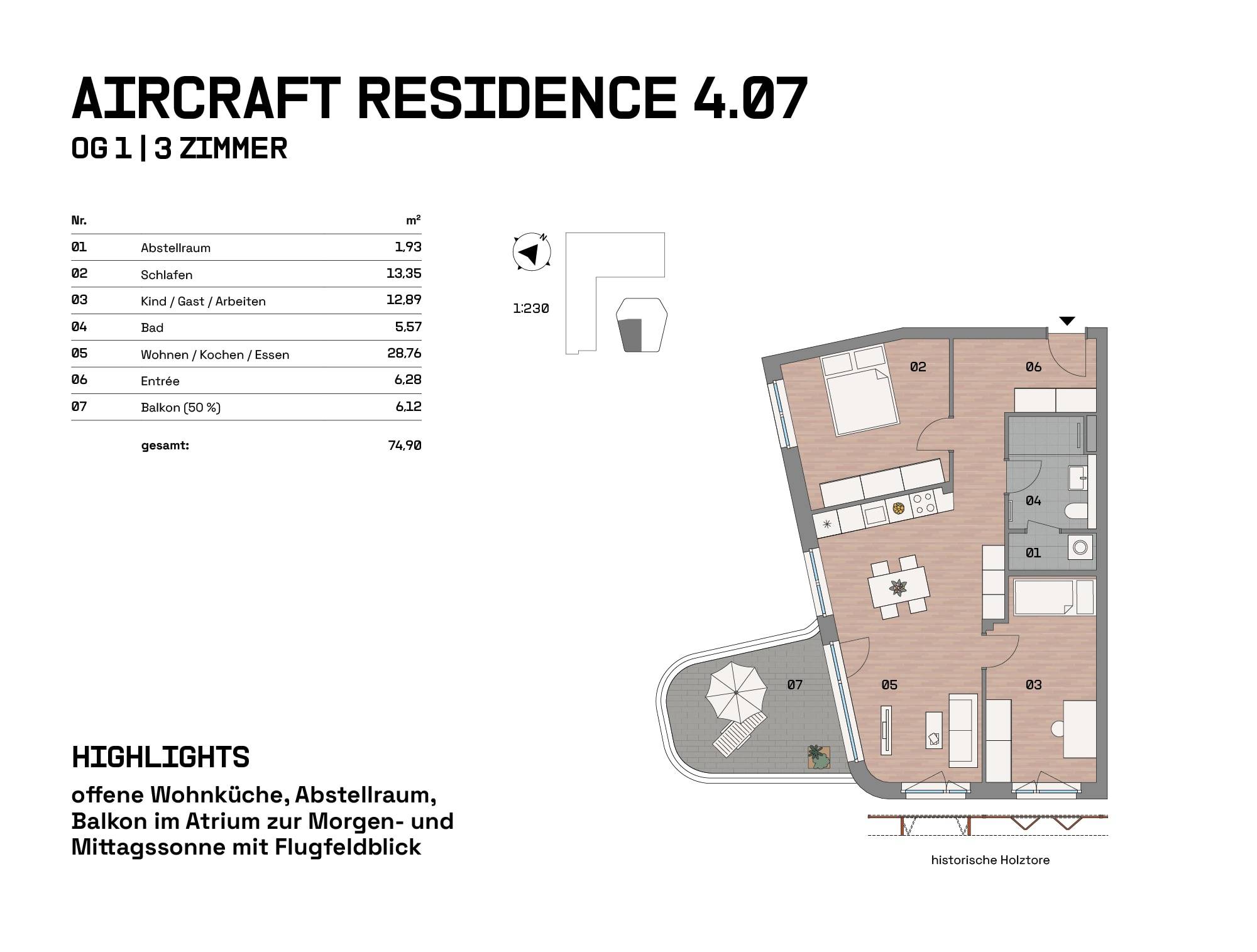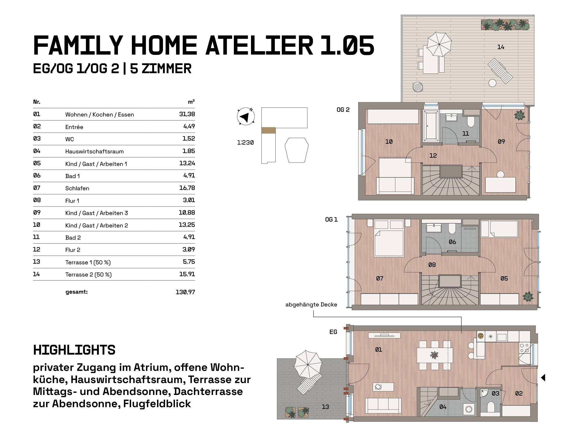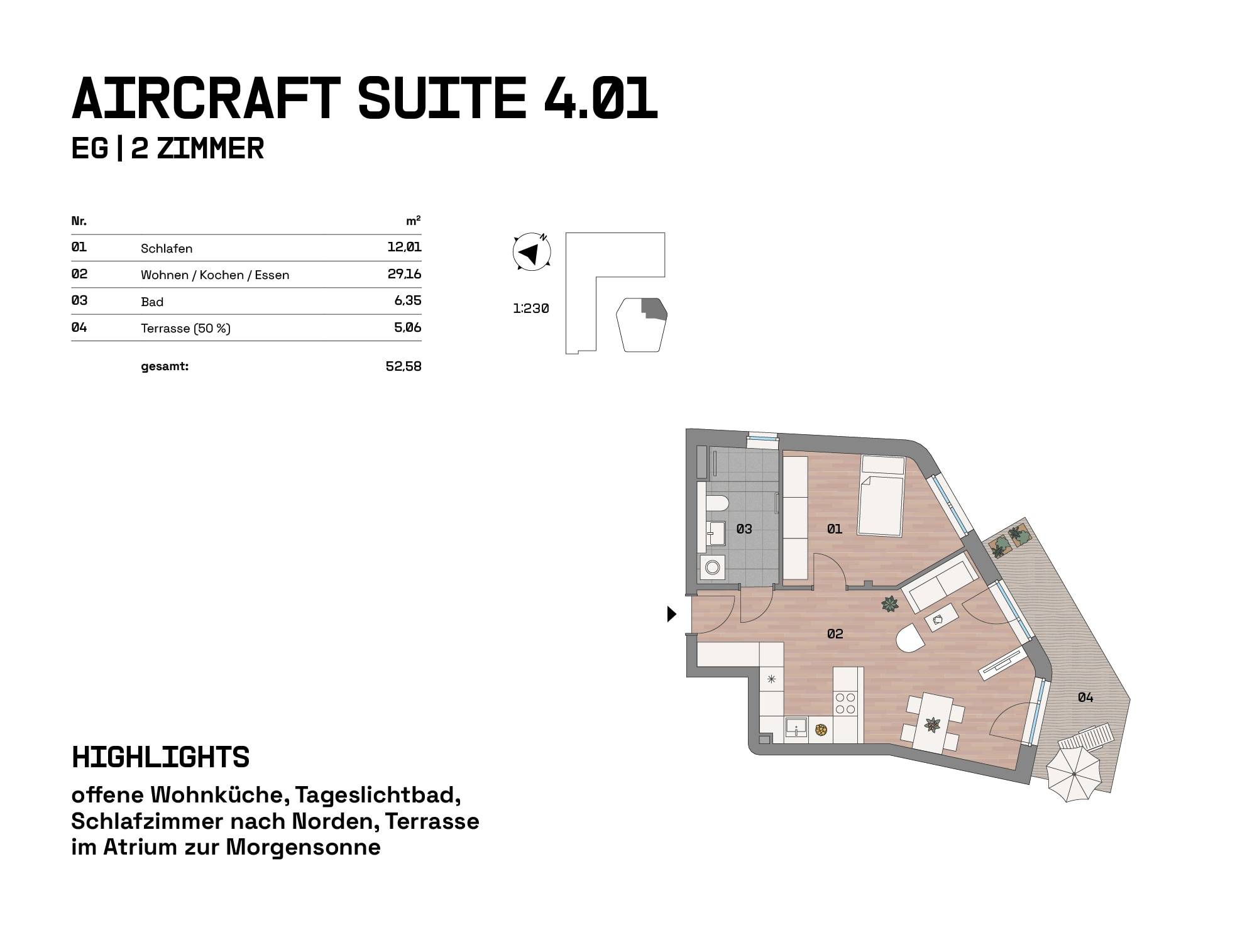 Im Hangar West der Endmontagehalle entstehen nach Sanierung 32 Wohnungen mit 1 bis 5 Zimmern zwischen 39 und 131 m². Das Atelier im Bestand und drei neue Häuser im Atrium bieten Loggien, Terrassen, Balkone, Wintergärten oder Dachterrassen. Eine Brücke verbindet die Einheiten. Wege, Treppen und Aufzüge erschließen das Ensemble. Autos parken auf Außenstellplätzen oder im Parkhaus. Der Außenraum im Atrium und um die Halle ist mit Sträuchern, Bäumen, Stauden, Flusssteinen und Flugzeugbeeten gestaltet.