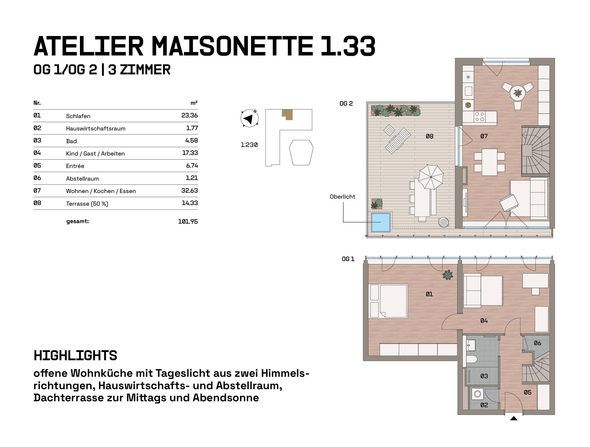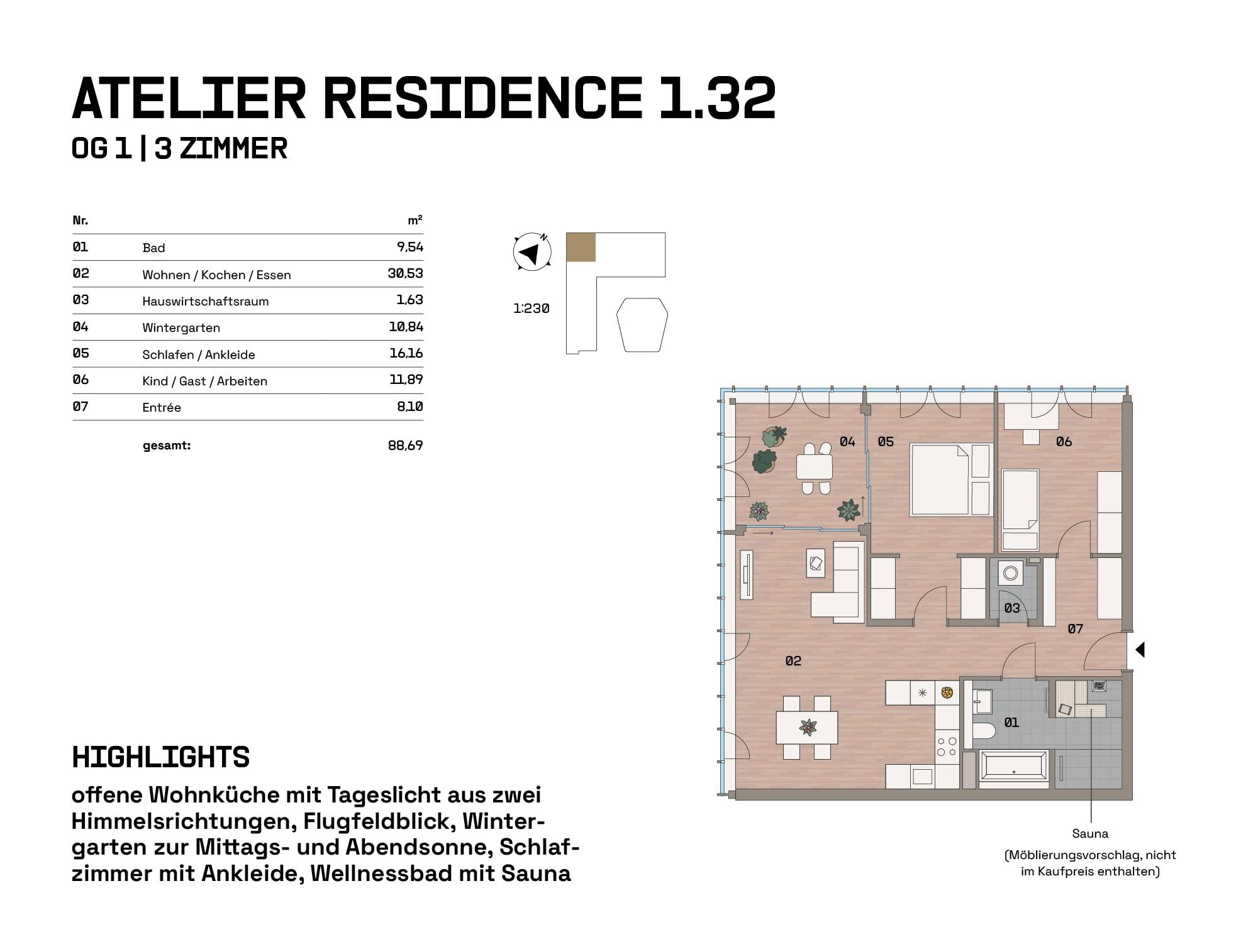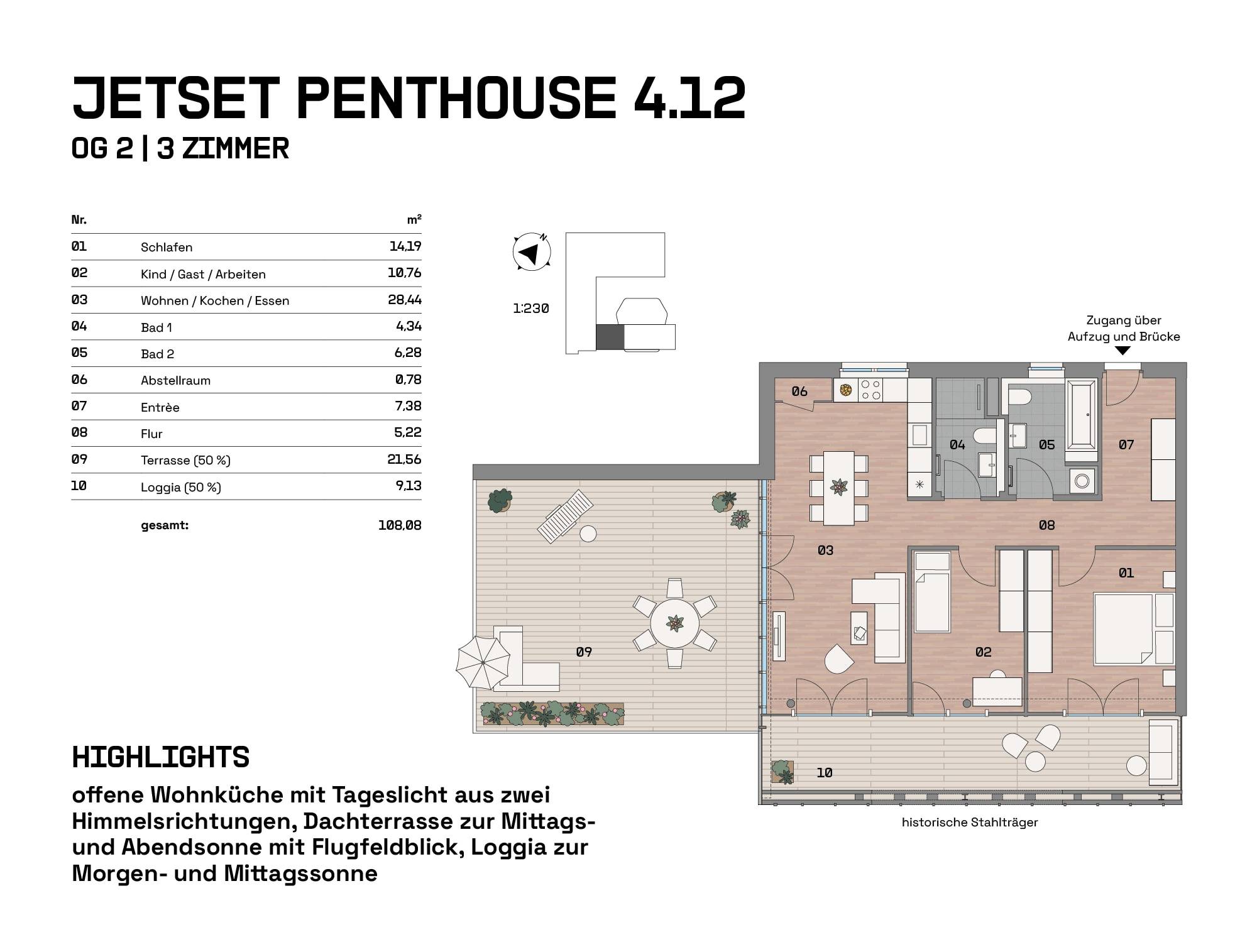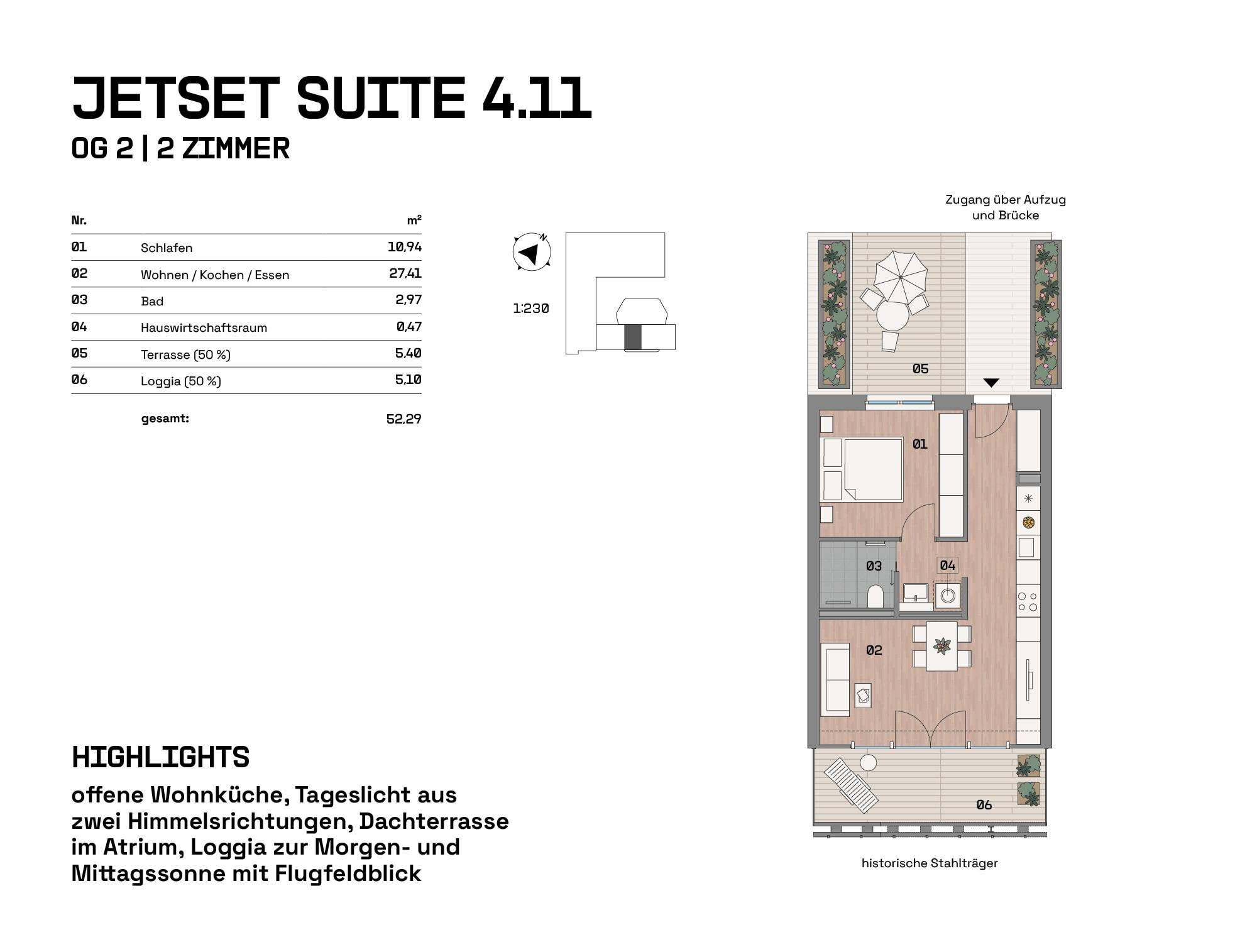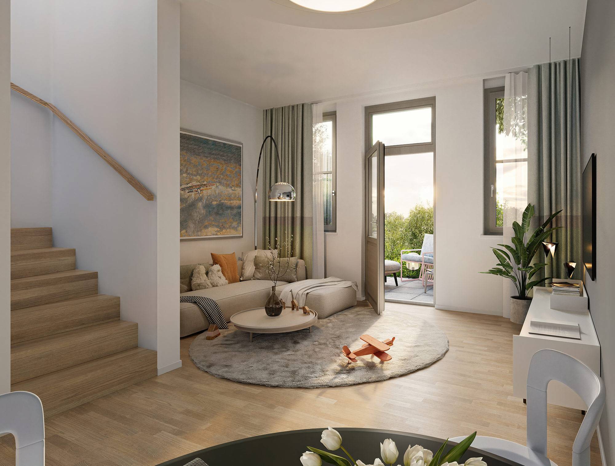 Im Hangar West der Endmontagehalle entstehen nach Sanierung 32 Wohnungen mit 1 bis 5 Zimmern zwischen 39 und 131 m². Das Atelier im Bestand und drei neue Häuser im Atrium bieten Loggien, Terrassen, Balkone, Wintergärten oder Dachterrassen. Eine Brücke verbindet die Einheiten. Wege, Treppen und Aufzüge erschließen das Ensemble. Autos parken auf Außenstellplätzen oder im Parkhaus. Der Außenraum im Atrium und um die Halle ist mit Sträuchern, Bäumen, Stauden, Flusssteinen und Flugzeugbeeten gestaltet.