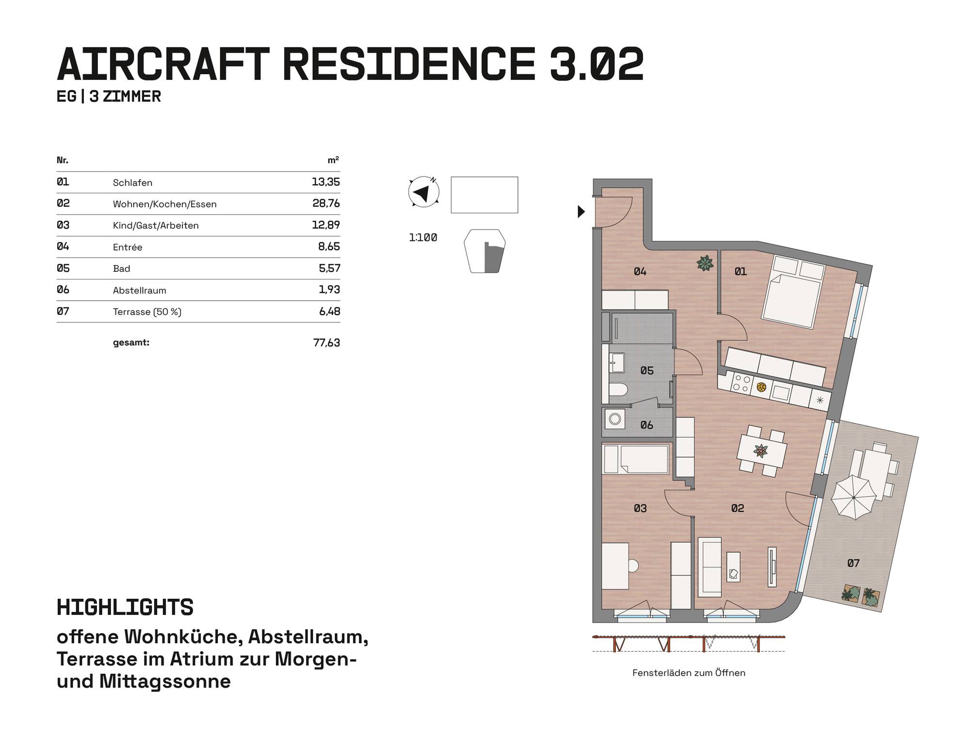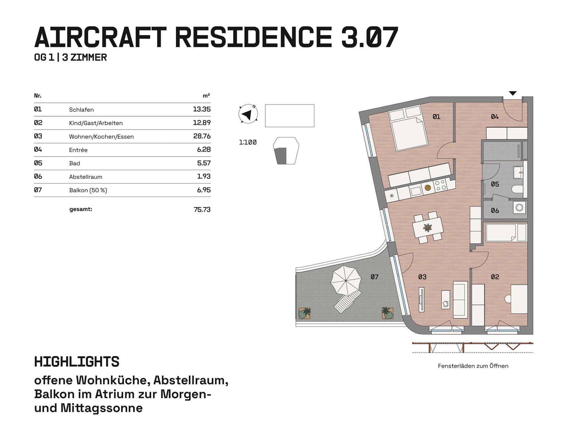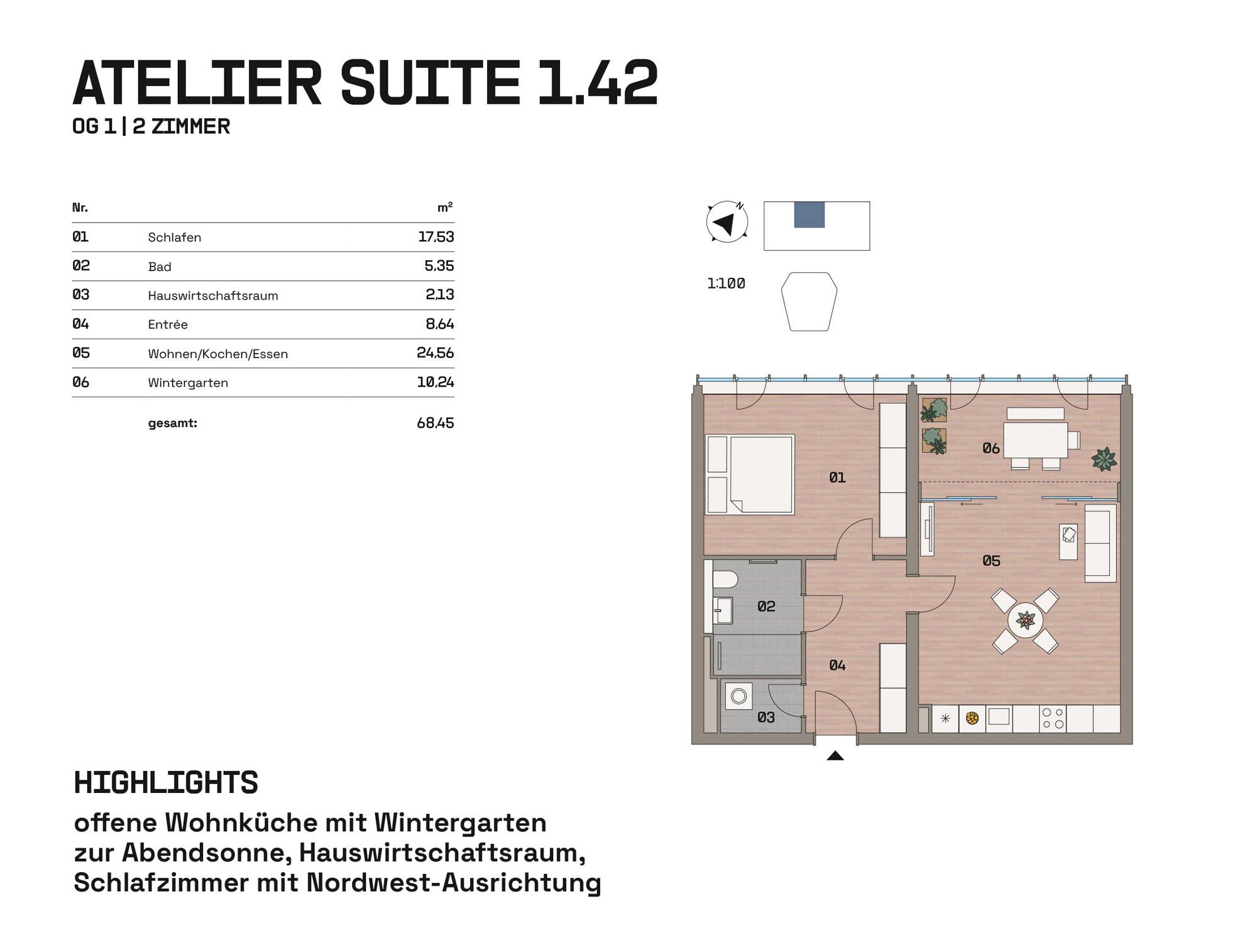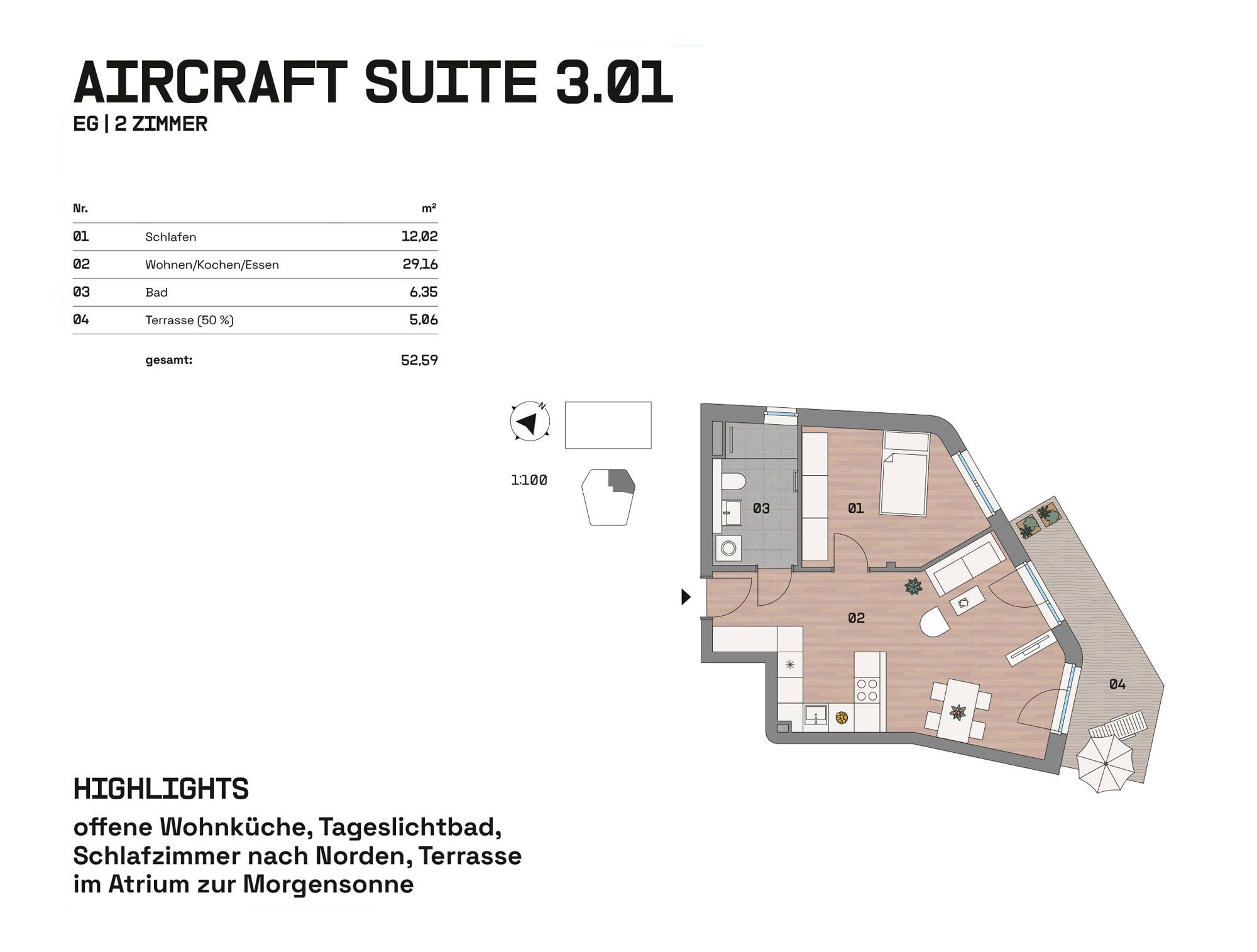 Im Hangar West der Endmontagehalle entstehen nach Sanierung 34 Wohnungen mit 1 bis 4 Zimmern zwischen 39 und 126 m². Das Atelier im Bestand und drei neue Häuser im Atrium bieten Loggien, Terrassen, Balkone, Wintergärten oder Dachterrassen. Eine Brücke verbindet die Einheiten. Wege, Treppen und Aufzüge erschließen das Ensemble. Autos parken auf Außenstellplätzen oder im Parkhaus. Der Außenraum im Atrium und um die Halle ist mit Sträuchern, Bäumen, Stauden, Flusssteinen und Flugzeugbeeten gestaltet.