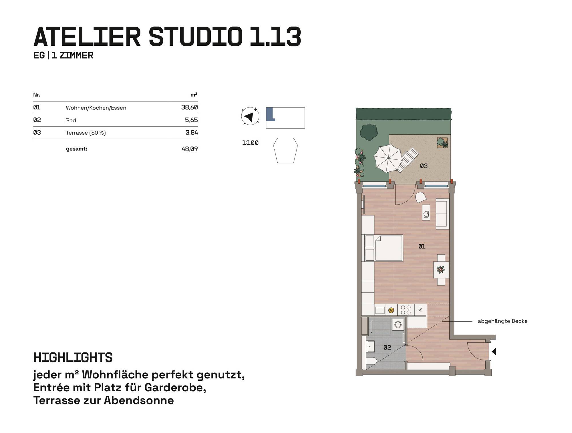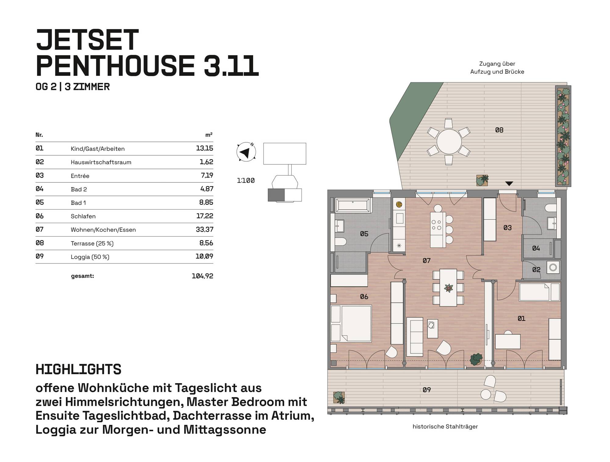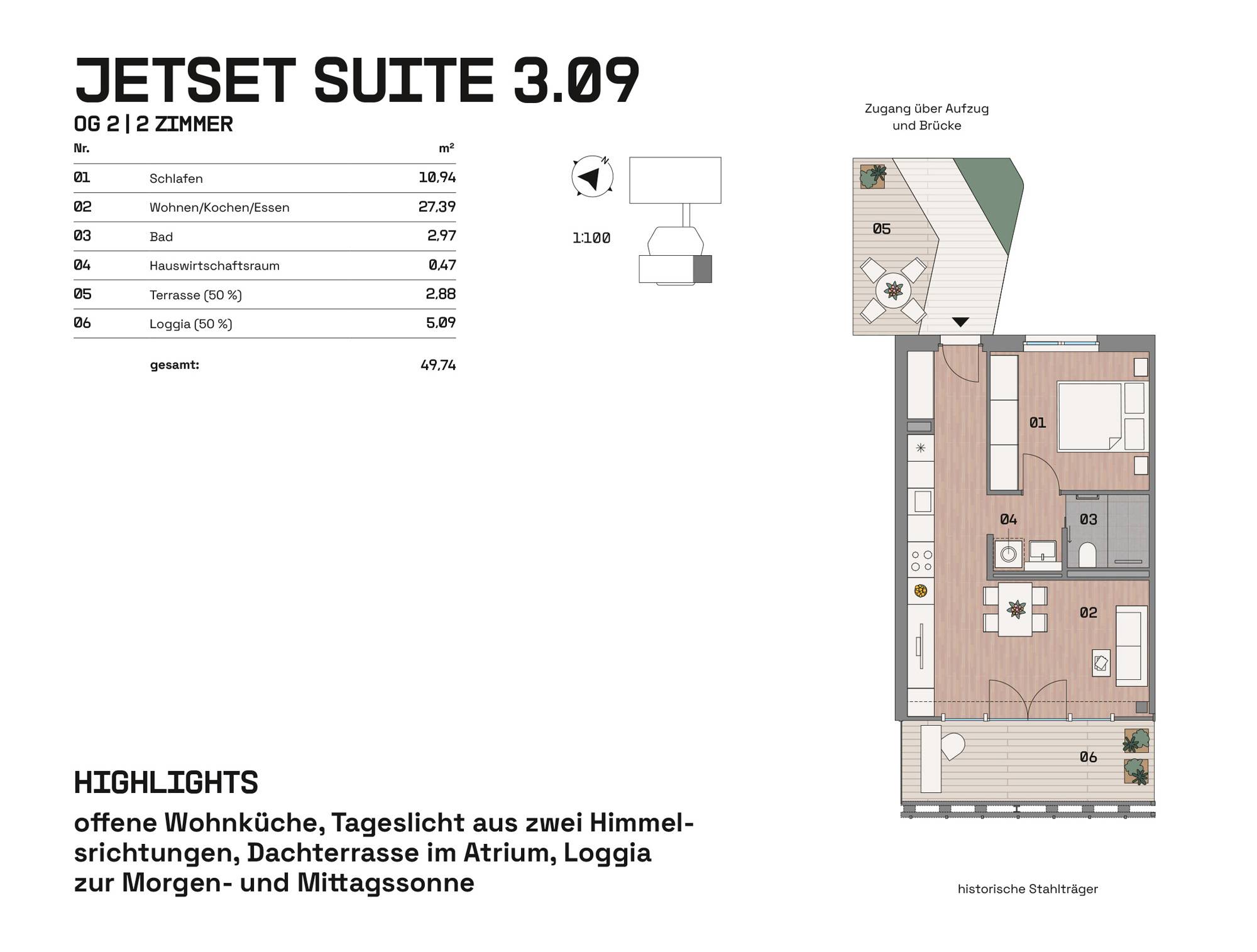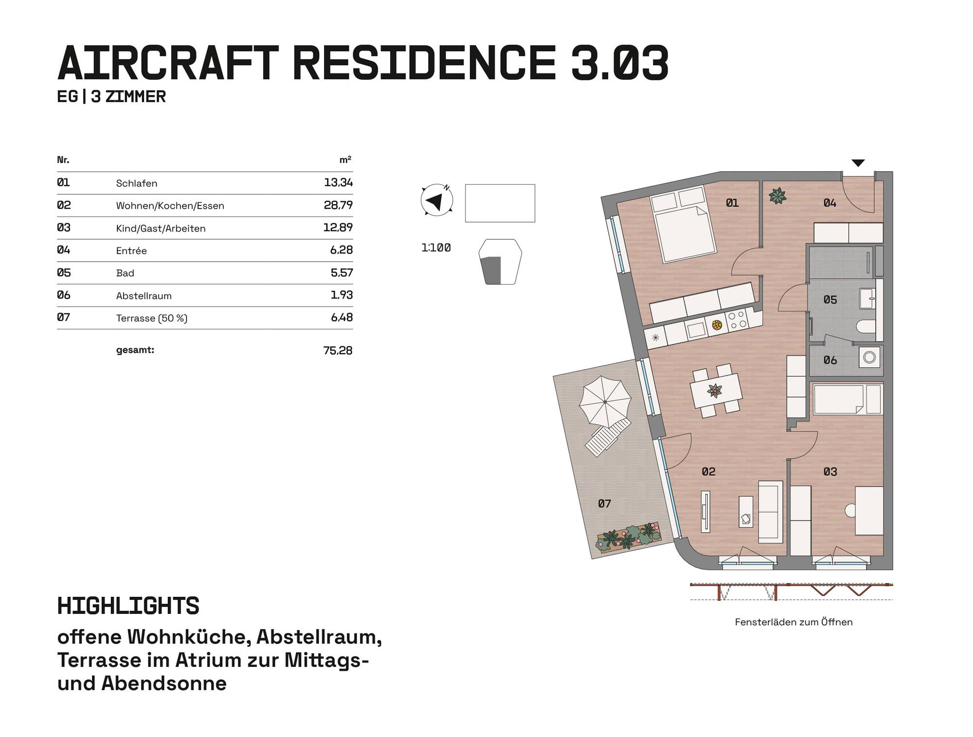 Im Hangar West der Endmontagehalle entstehen nach Sanierung 34 Wohnungen mit 1 bis 4 Zimmern zwischen 39 und 126 m². Das Atelier im Bestand und drei neue Häuser im Atrium bieten Loggien, Terrassen, Balkone, Wintergärten oder Dachterrassen. Eine Brücke verbindet die Einheiten. Wege, Treppen und Aufzüge erschließen das Ensemble. Autos parken auf Außenstellplätzen oder im Parkhaus. Der Außenraum im Atrium und um die Halle ist mit Sträuchern, Bäumen, Stauden, Flusssteinen und Flugzeugbeeten gestaltet.