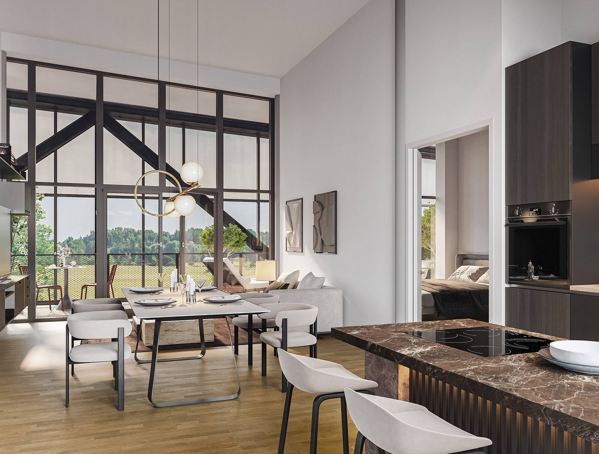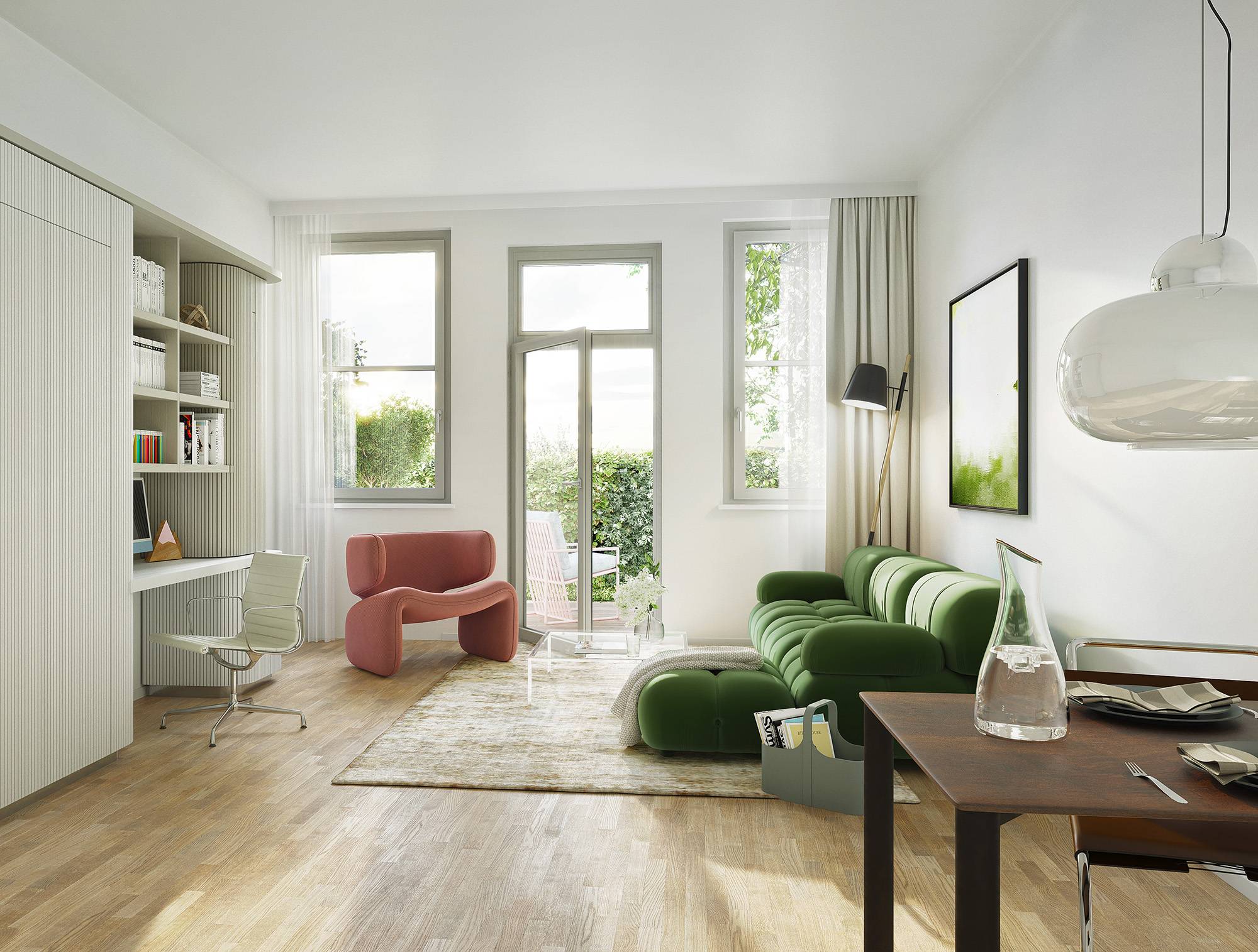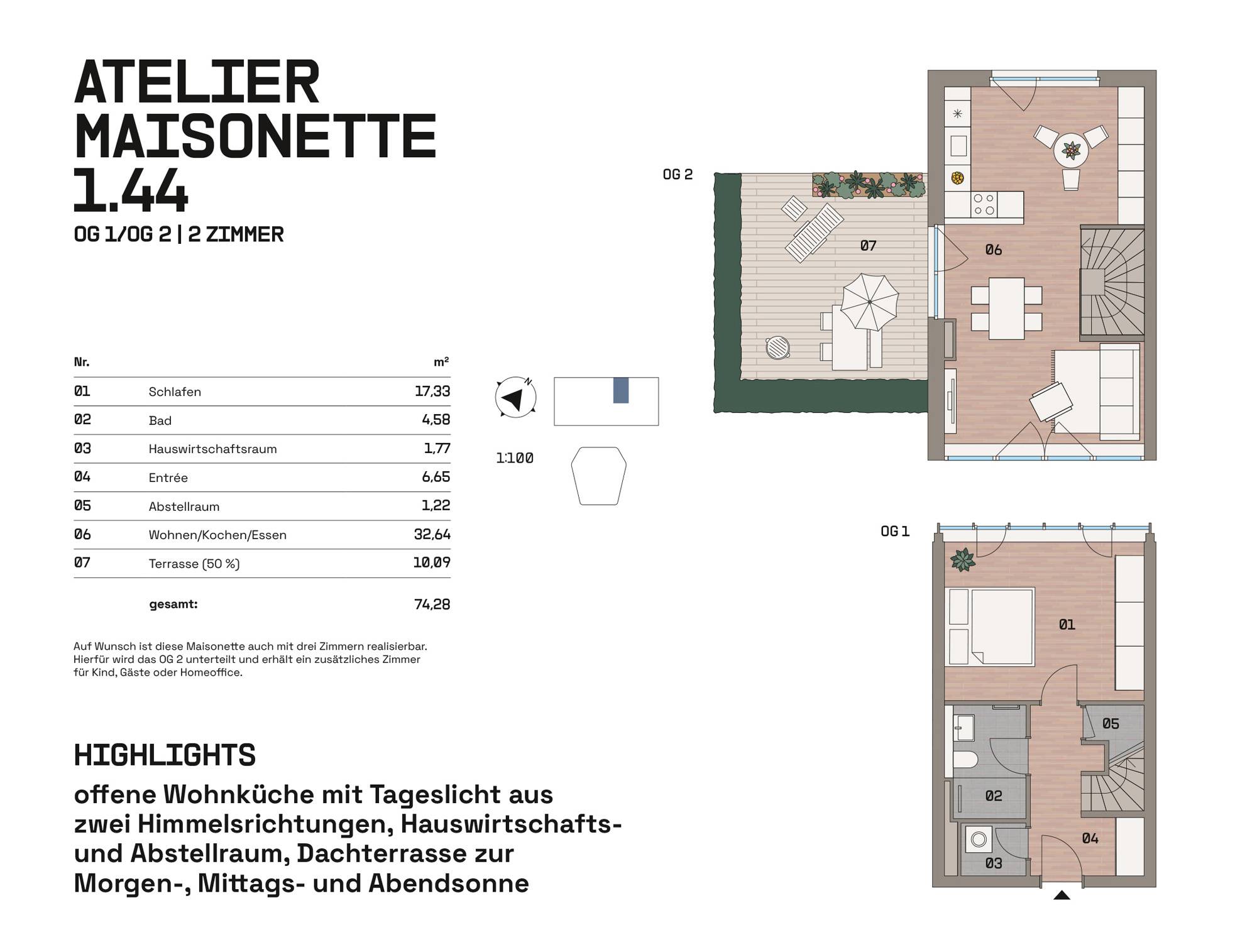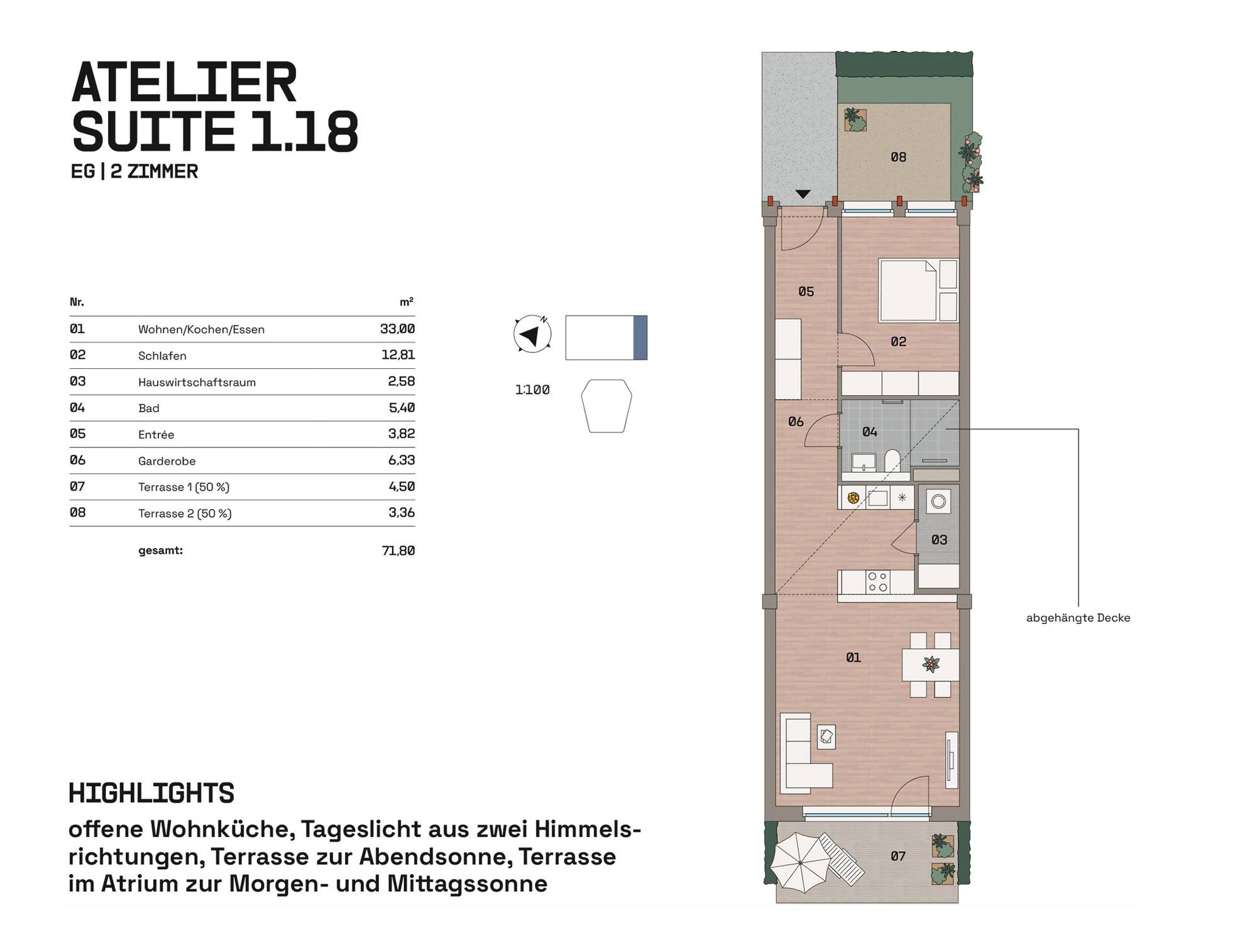 Im Hangar West der Endmontagehalle entstehen nach Sanierung 34 Wohnungen mit 1 bis 4 Zimmern zwischen 39 und 126 m². Das Atelier im Bestand und drei neue Häuser im Atrium bieten Loggien, Terrassen, Balkone, Wintergärten oder Dachterrassen. Eine Brücke verbindet die Einheiten. Wege, Treppen und Aufzüge erschließen das Ensemble. Autos parken auf Außenstellplätzen oder im Parkhaus. Der Außenraum im Atrium und um die Halle ist mit Sträuchern, Bäumen, Stauden, Flusssteinen und Flugzeugbeeten gestaltet.