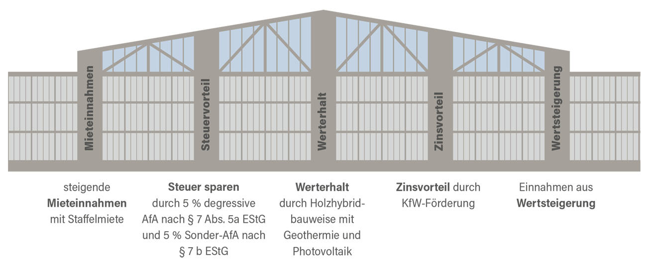 Ihr Erfolg mit der Markenimmobilie BUC-36® als Kapitalanlage steht u. a. auf folgenden Säulen: Mieteinnahmen, Steuervorteil, Tilgungszuschuss und Zinsvorteil durch KfW-Förderung und Einnahmen aus der Wertsteigerung Ihrer Immobilie. Sie investieren in Ihre Altersvorsorge und können Vermögen aufbauen. Überzeugen Sie sich selbst!